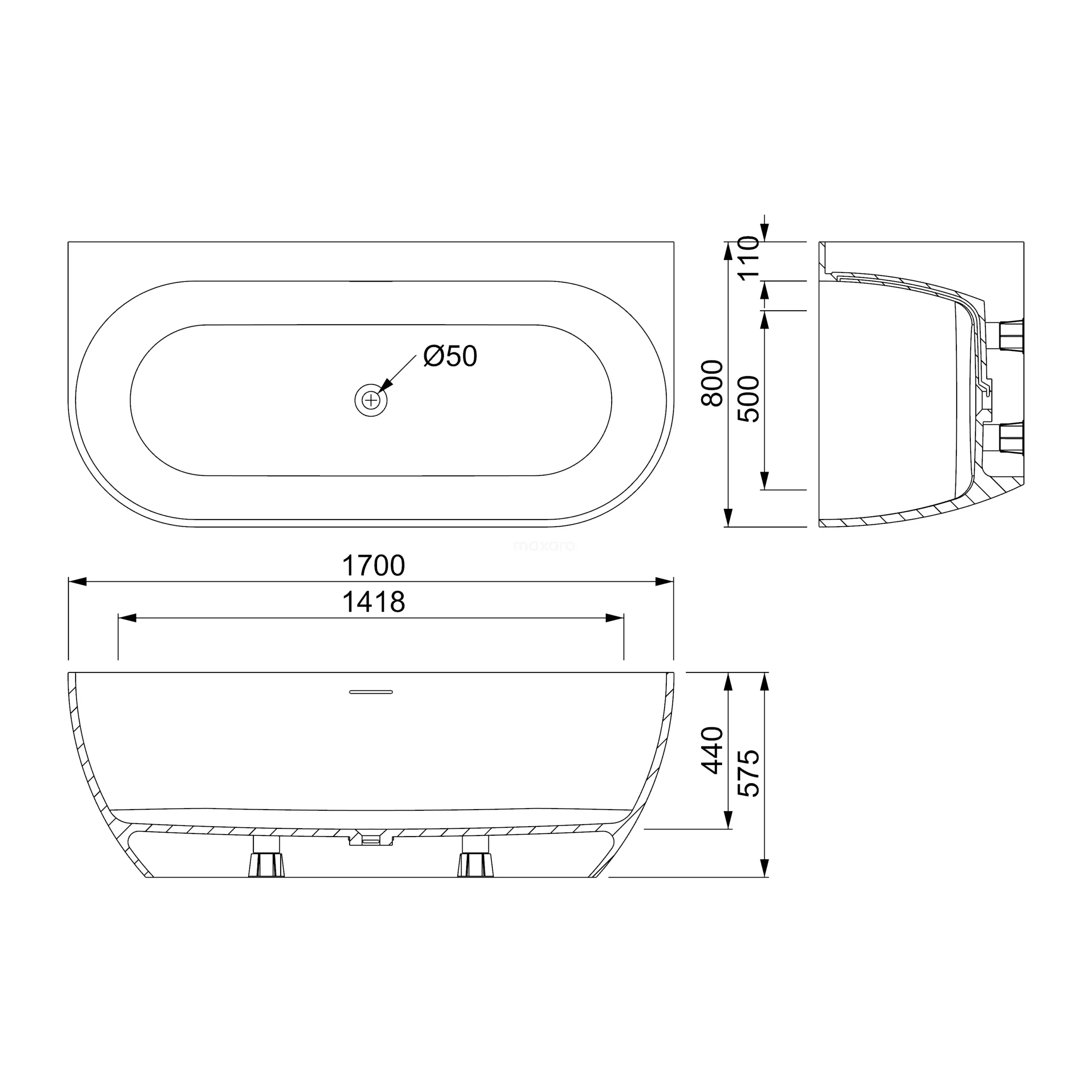 Het bad is zeer eenvoudig te installeren dankzij de voorgemonteerde stelpoten, waarmee u het bad perfect waterpas monteert. Dit exemplaar kan halfvrijstaand worden geplaatst.