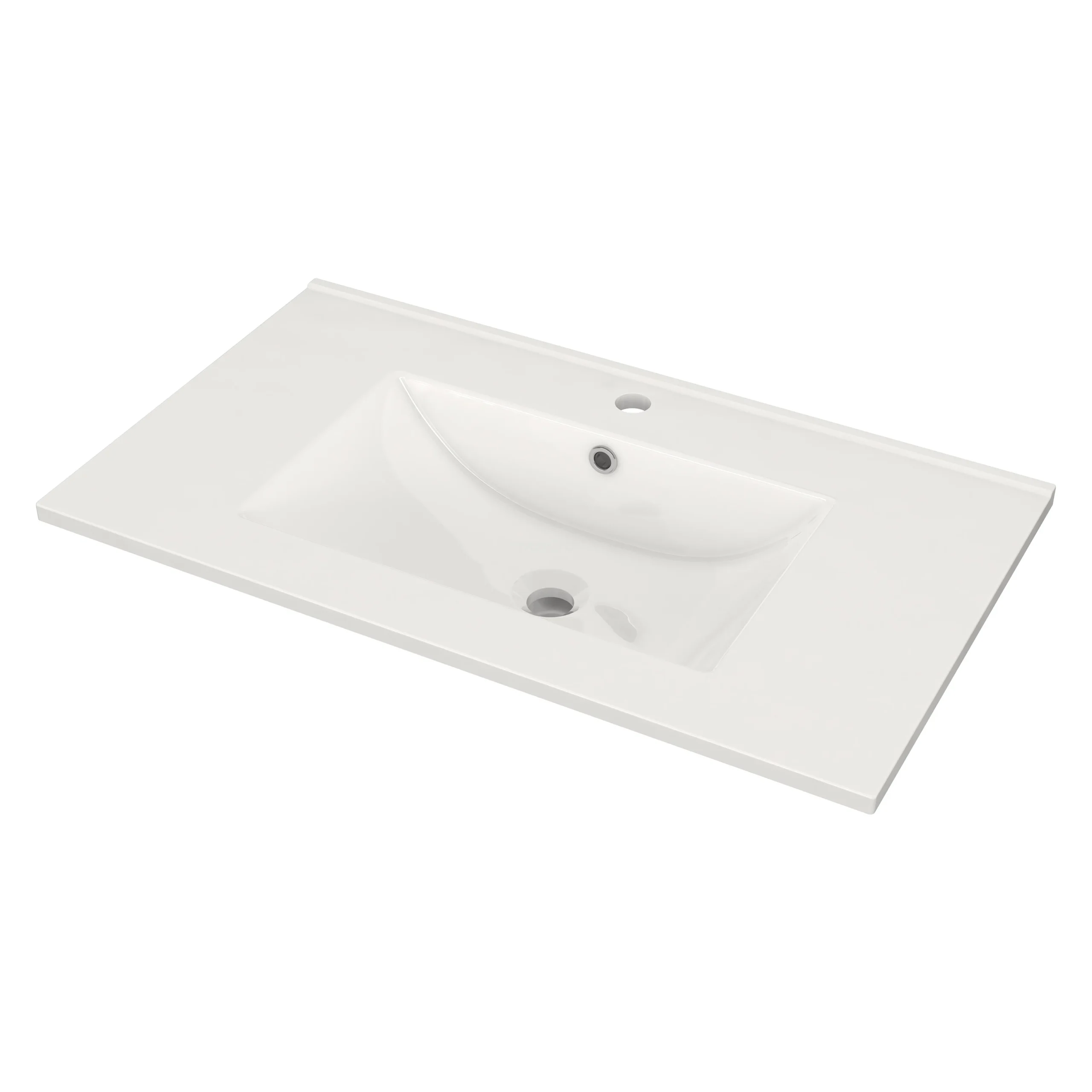 Het badkamermeubel is voorzien van een witte Cera-wastafel met een rechthoekige vorm en een vloeiende ronding aan de binnenkant. De brede rand creëert extra plaats om badkamerspullen neer te zetten. Dit tijdloze model met chromen overloop is gemaakt van keramiek. Het materiaal is slijtvast, hittebestendig en onderhoudsvriendelijk. Zo profiteert u van ultiem schoonmaakgemak.