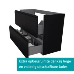 Dankzij het stijlvolle design is dit badkamermeubel de eyecatcher van uw badkamer. De zwarte onderkast zorgt voor een opvallend accent en vormt de perfecte basis voor een industrieel interieur. De strakke L-vormige handgrepen van aluminium hebben een matte afwerking en maken het plaatje af.