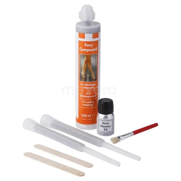 Deze compound afdichtingsset bevat een afdichtingskit, ontvetter, kwastje, 2 afmesspatels en 2 mengnozzles. Met deze set zorgt u ervoor dat de naden tussen uw douchegoot en tegels volledig worden afgesloten, waardoor lekkages en schimmels geen kans krijgen. Middels de kitspuit sluit u de naden eenvoudig af. Bovendien is de kit geschikt voor alle tegelsoorten. Hierbij dient u er rekening mee te houden dat de naden minimaal 5 mm breed en 10 mm diep zijn.