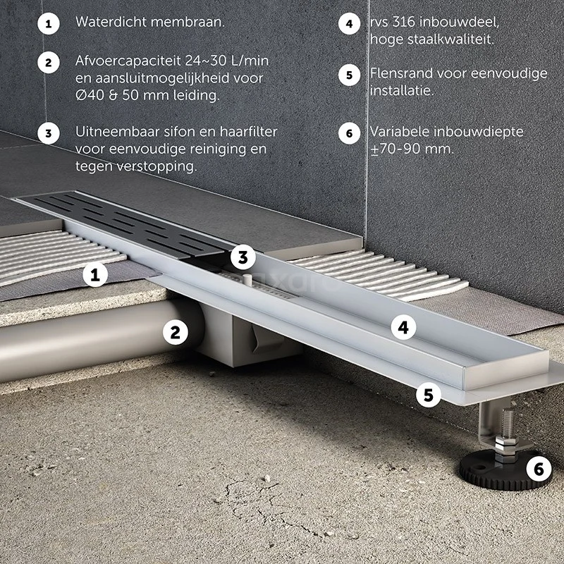 U ervaart ultiem onderhoudsgemak met dit model. Deze douchegoot heeft onder andere over een haarfilter. Hierdoor zijn verstoppingen van uw leidingen voorgoed verleden tijd. Verder zorgt de flensrand en het waterdicht membraan voor een 100% waterdichte afsluiting. Daarnaast is de goot voorzien van een uitneembare sifon. Schoonmaken kost u op deze manier maar weinig tijd en moeite.