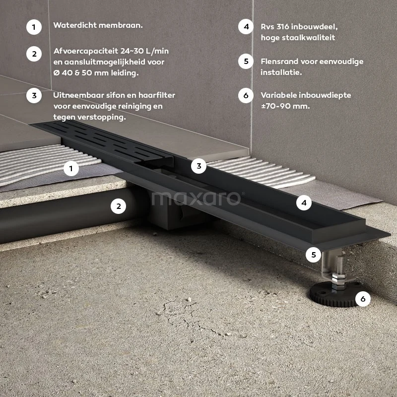 U ervaart ultiem onderhoudsgemak met dit model. Deze douchegoot beschikt onder andere over een haarfilter. Hierdoor zijn verstoppingen van uw leidingen voorgoed verleden tijd. Verder zorgt de flensrand en het waterdicht membraan voor een 100% waterdichte afsluiting. Daarnaast is de goot voorzien van een uitneembare sifon. Schoonmaken kost u op deze manier maar weinig tijd en moeite.