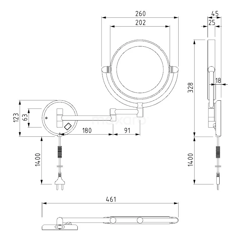 Dit model is eenvoudig tegen de wand te bevestigen. Om de verlichting aan en uit te zetten beschikt de make-up spiegel over een schakelaar en stekker. Door de draaibare spiegelhouder draait u de spiegel moeiteloos naar de gewenste richting.