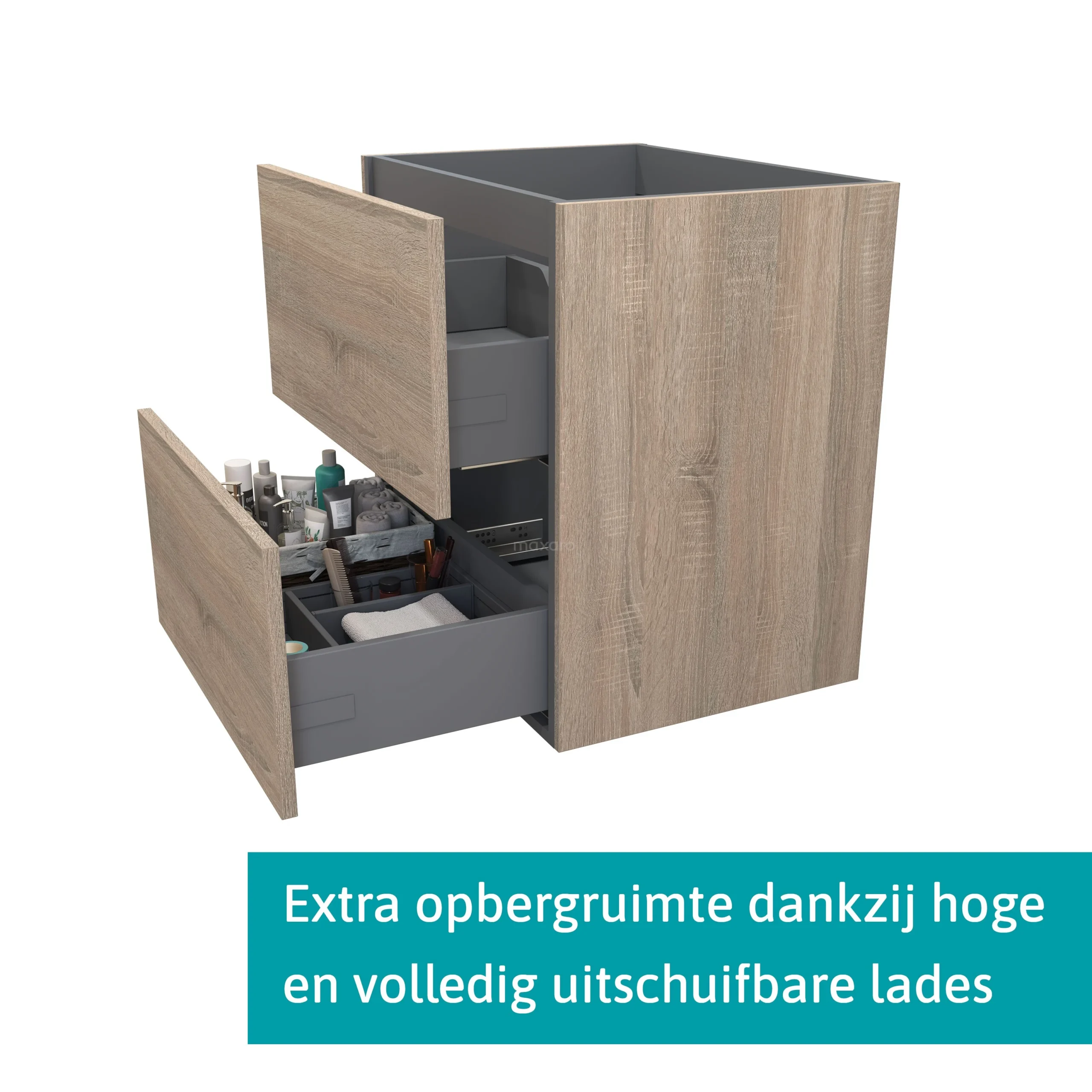 De onderkast is uitgerust met 2 lades, waarin u plaats heeft voor al uw badkamerspullen. Door het systeem met softopen en -close openen en sluiten de lades geluidloos. Bovendien zijn ze extra hoog en volledig uitschuifbaar. Verder heeft het meubel een slimme sifonuitsparing. Hierdoor benut u de beschikbare ruimte optimaal.