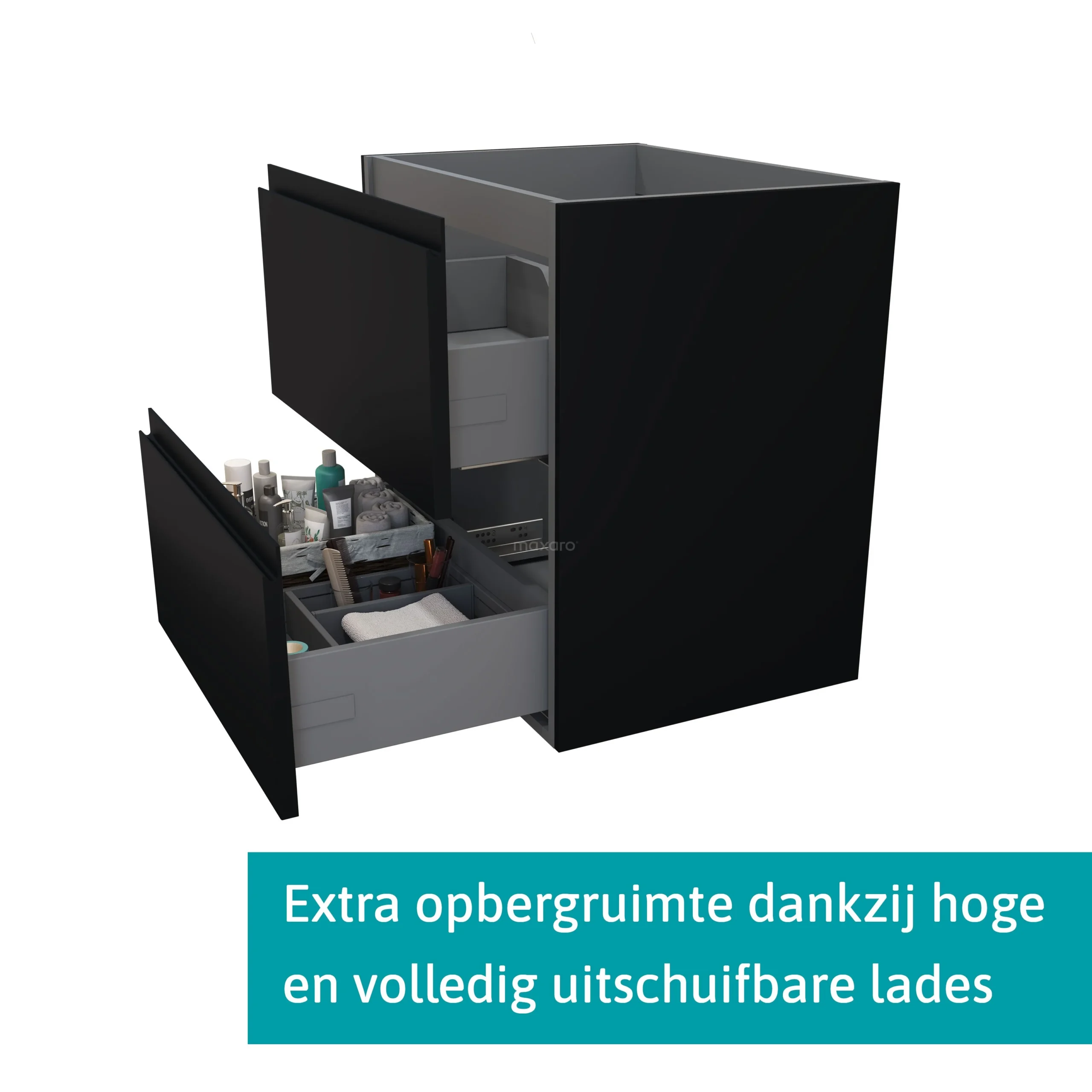 De onderkast is uitgerust met 2 lades, waarin u plaats heeft voor al uw badkamerspullen. Door het systeem met softopen en -close openen en sluiten de lades geluidloos. Bovendien zijn ze extra hoog en volledig uitschuifbaar. Verder heeft het meubel een slimme sifonuitsparing. Hierdoor benut u de beschikbare ruimte optimaal.