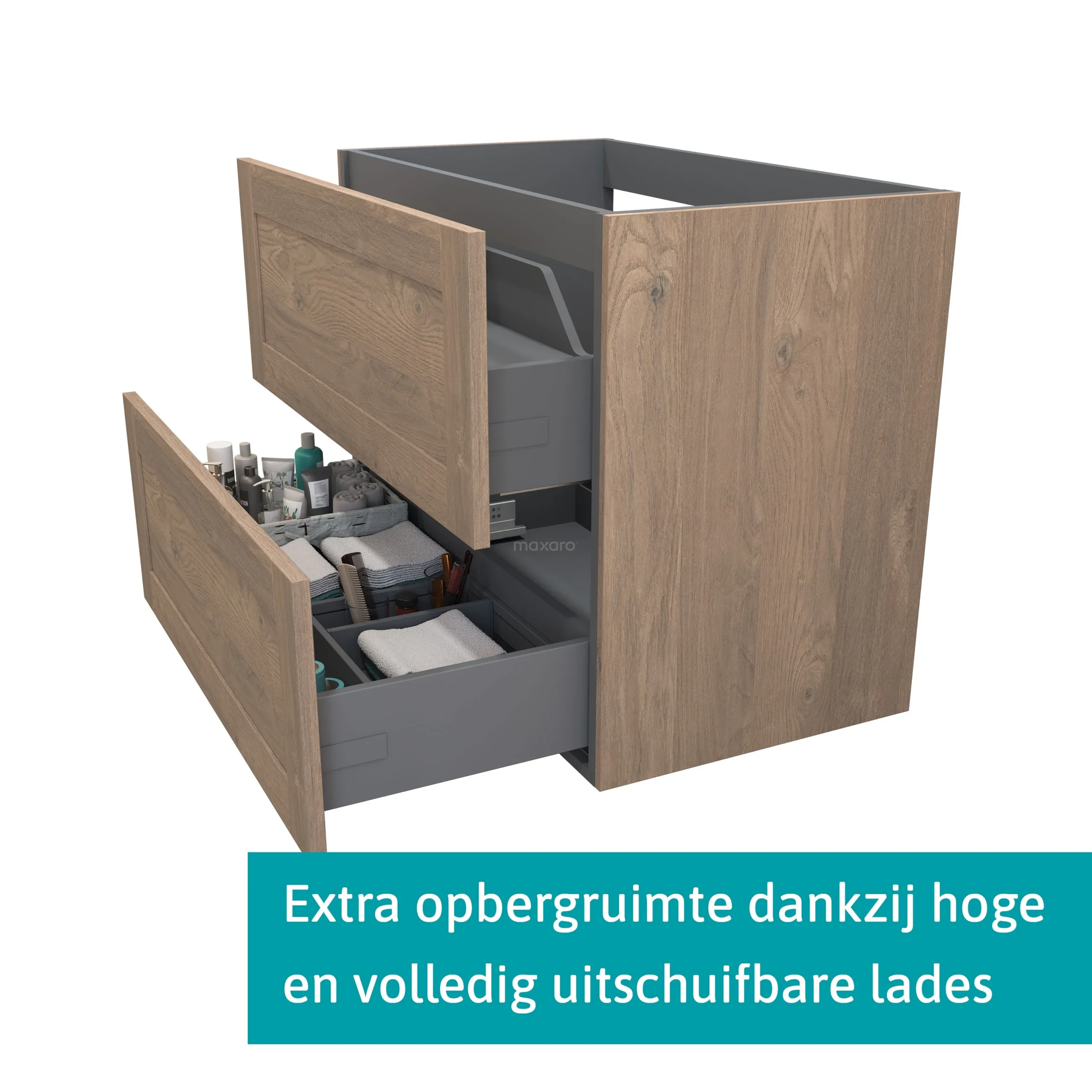 Dankzij het stijlvolle design is dit badkamermeubel de eyecatcher van uw badkamer. De onderkast is voorzien van een kaderfront en heeft een middenbruin eiken afwerking. Deze prachtige eikenlook creëert een warme sfeer in uw badkamerinterieur. Daarnaast zorgt het kaderfront voor een klassieke touch. De handgrepen dient u zelf toe te voegen. Deze zijn verkrijgbaar in verschillende kleuren en vormen.