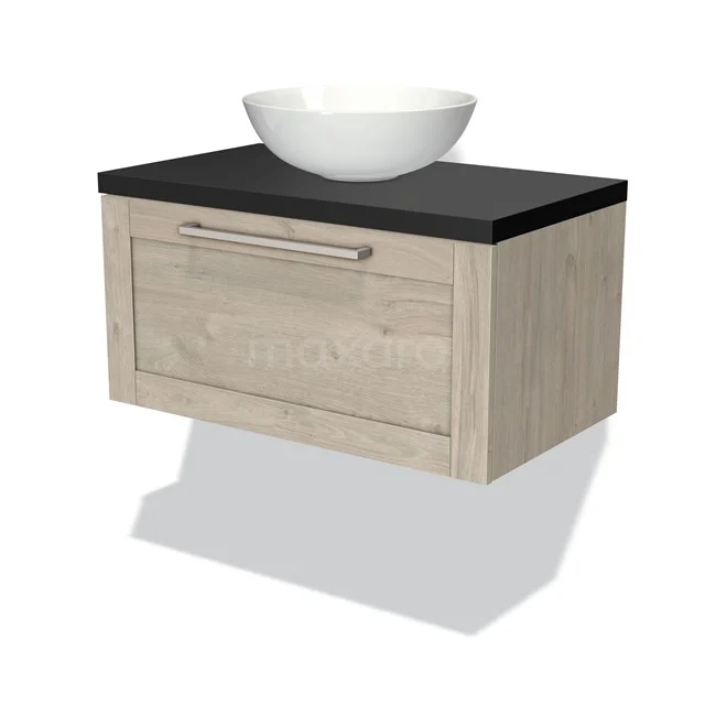Dankzij het prachtige design is dit badkamermeubel de eyecatcher van uw badkamer. De lichtgrijs eiken onderkast heeft een sfeervolle uitstraling en is voorzien van een wastafelblad in mat zwart. Daarnaast beschikt het meubel over een kaderfront voor een klassieke touch. De handgreep dient u zelf toe te voegen. Deze is verkrijgbaar in verschillende kleuren en vormen.