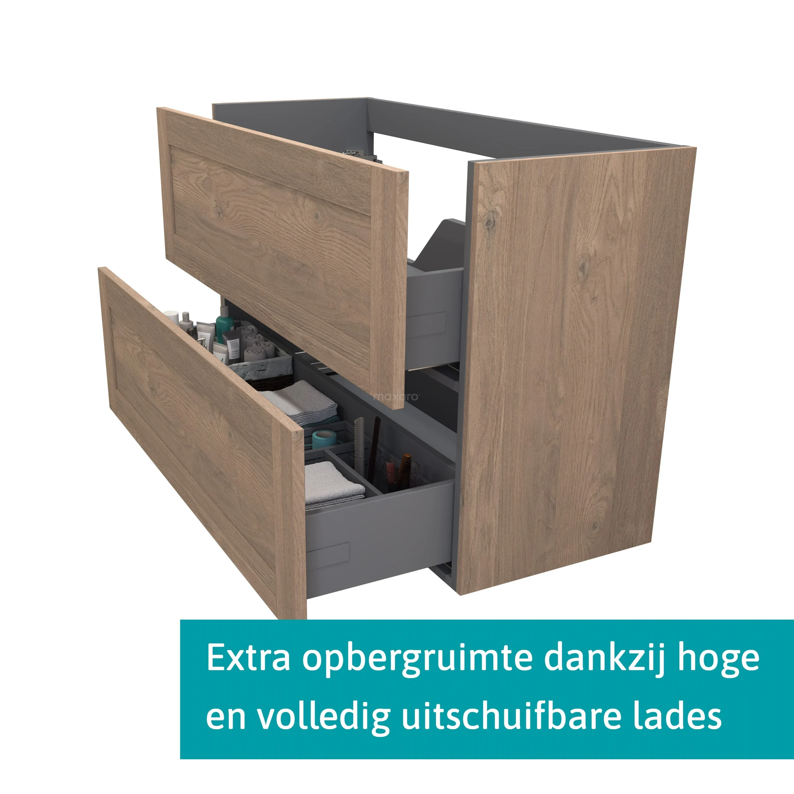 Dankzij het stijlvolle design is dit badkamermeubel de eyecatcher van uw badkamer. De onderkast is voorzien van een kaderfront en heeft een middenbruin eiken afwerking. Deze prachtige eikenlook creëert een warme sfeer in uw badkamerinterieur. Daarnaast zorgt het kaderfront voor een klassieke touch. De handgrepen dient u zelf toe te voegen. Deze zijn verkrijgbaar in verschillende kleuren en vormen.