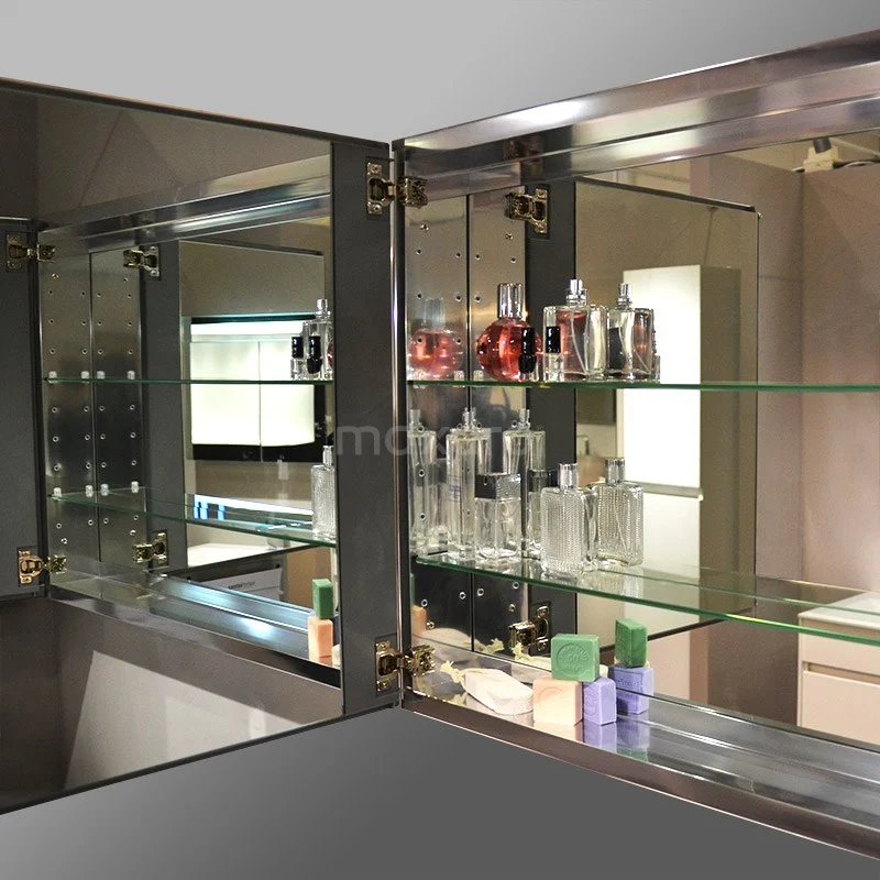 Dit tijdloze exemplaar is uitgevoerd in aluminium en heeft een rechthoekig design. De kast beschikt over spiegels aan de voor- en zijkant, op de binnenzijde van de deur en zelfs op de achterwand. Door het tijdloze uiterlijk komt de spiegelkast in elke badkamerstijl tot zijn recht. Bovendien zorgen de spiegels voor een ruimtelijk effect in uw badkamer.