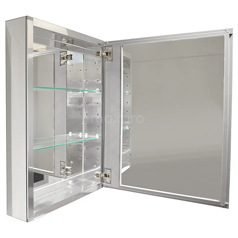 Dit tijdloze exemplaar is uitgevoerd in aluminium en heeft een rechthoekig design. De kast beschikt over spiegels aan de voor- en zijkant, op de binnenzijde van de deur en zelfs op de achterwand. Door het tijdloze uiterlijk komt de spiegelkast in elke badkamerstijl tot zijn recht. Bovendien zorgen de spiegels voor een ruimtelijk effect in uw badkamer.