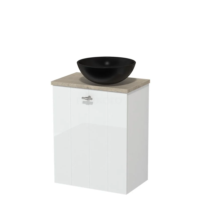 Dankzij het prachtige design is het meubel een blikvanger in de toiletruimte. De onderkast heeft een hoogglans witte afwerking met een lichtgrijs eiken wastafelblad.