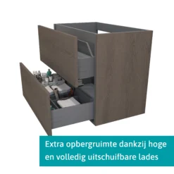 Dankzij het prachtige design is het meubel een blikvanger in de toiletruimte. De onderkast heeft een hoogglans witte afwerking met een grijs eiken wastafelblad.