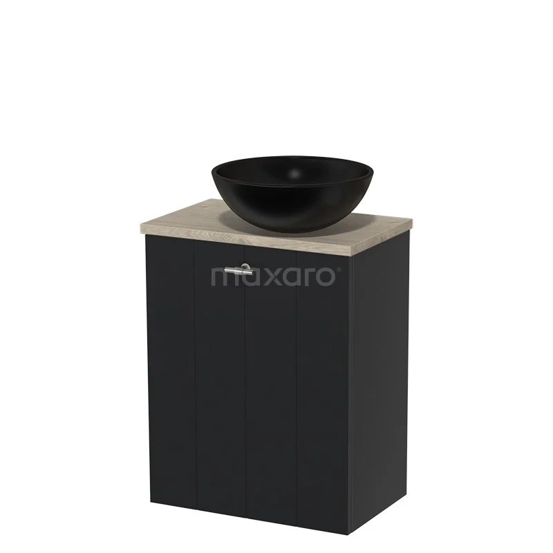 Dankzij het prachtige design is het meubel een blikvanger in de toiletruimte. De onderkast heeft een mat zwarte afwerking met een lichtgrijs eiken wastafelblad.