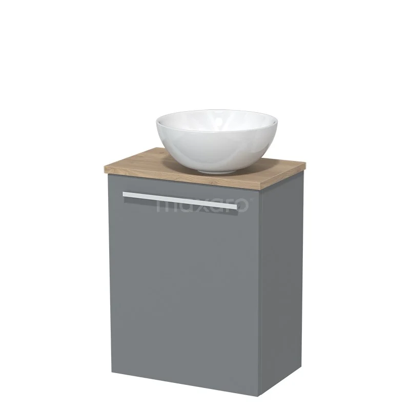 Dankzij het prachtige design is het meubel een blikvanger in de toiletruimte. De onderkast heeft een middengrijze afwerking met een lichtbruin eiken wastafelblad.
