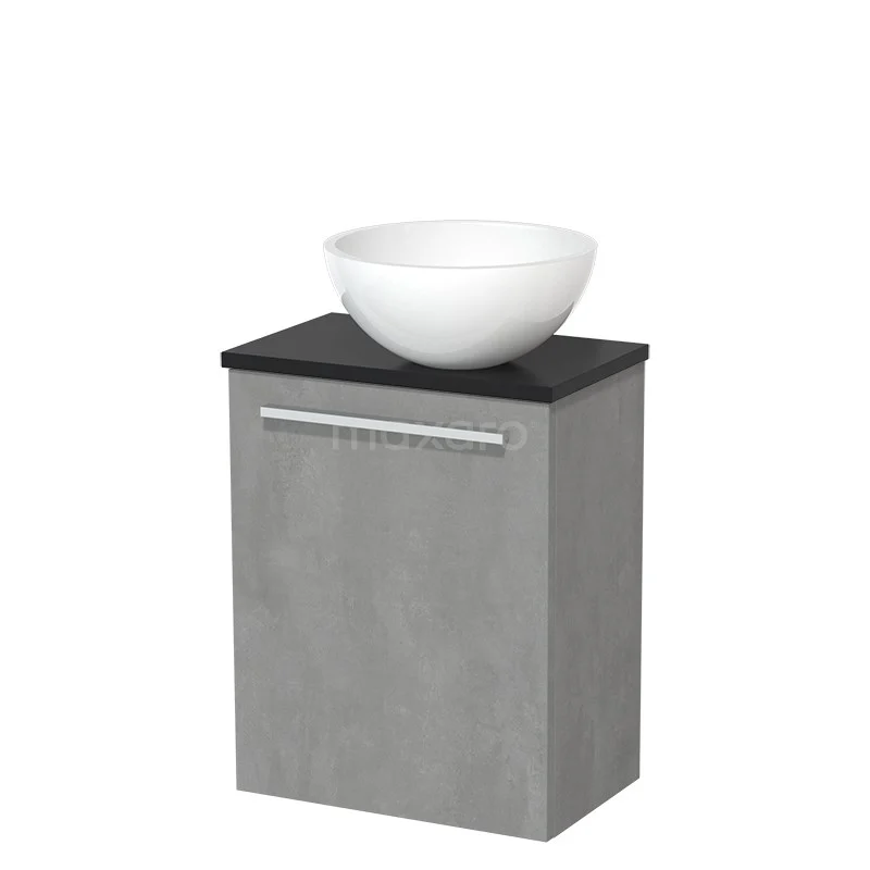 Dankzij het prachtige design is het meubel een blikvanger in de toiletruimte. De onderkast heeft een lichtgrijs betonnen afwerking met een mat zwart wastafelblad.