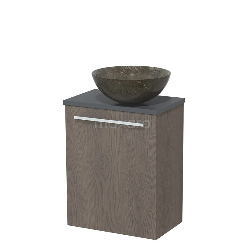 Dankzij het prachtige design is het meubel een blikvanger in de toiletruimte. De onderkast heeft een donkerbruin eiken afwerking met een donkergrijs wastafelblad.