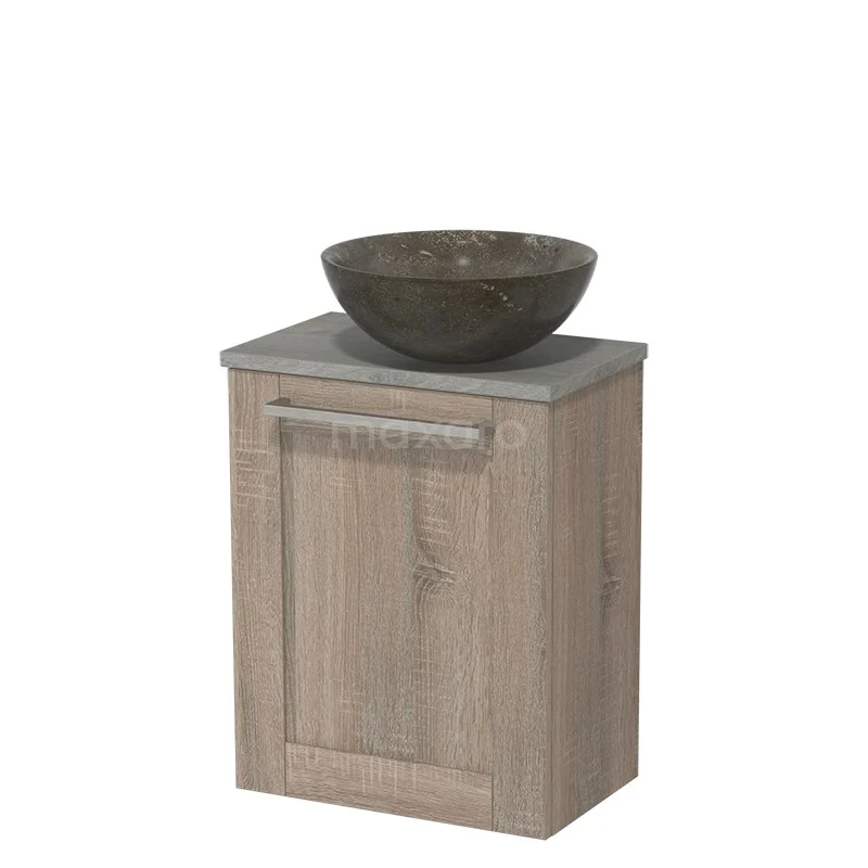 Het toiletmeubel is gecombineerd met een Novanta waskom. Deze stijlvolle waskom is gemaakt van natuursteen met een blue stone afwerking.