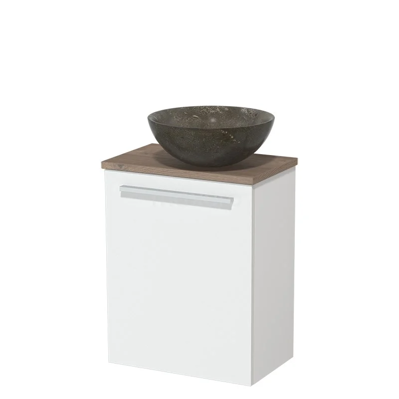 Het toiletmeubel is gecombineerd met een Novanta waskom. Deze stijlvolle waskom is gemaakt van natuursteen met een blue stone afwerking.