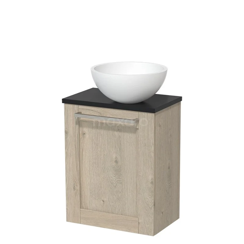 Dankzij het prachtige design is het meubel een blikvanger in de toiletruimte. De onderkast heeft een lichtgrijs eiken afwerking met een mat zwart wastafelblad.